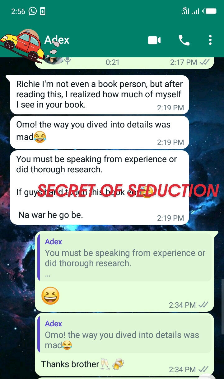 Real change is measured in months, not days. Don't expect to approach the girl of your dreams tomorrow and propose to her because you read a book. Anyone who tells you otherwise is more interested in selling to you than in assisting you; change takes time and effort."These tips doesn't only apply to the dating world......it can also be applied to all aspects of a man's life in other to achieve his goals."Being happy requires having happy relationships. The company of a good woman you love is incomparable. I believe that's all any man really wants in the end. If the world were to end tomorrow, all we would want is to feel comfort in our lover's arms today.